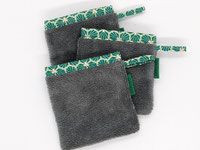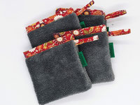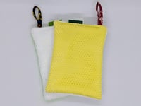 Pochettes et filets à savon ou shampoing solide, gants démaquillants à l'eau, gants de toilette, éponges de surface durables, papier toilette lavable, ect...
