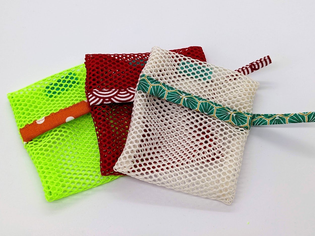 Filet à suspendre. Permet d'utiliser ses savons jusqu'ou bout. Permet une bonne aération du savon ou shampoing solide, qui ne stagne plus dans l'eau. Dimensions aléatoires. Composition : Filet 100 % polyester. Biais et lien 100 % coton. Plusieurs coloris disponibles.